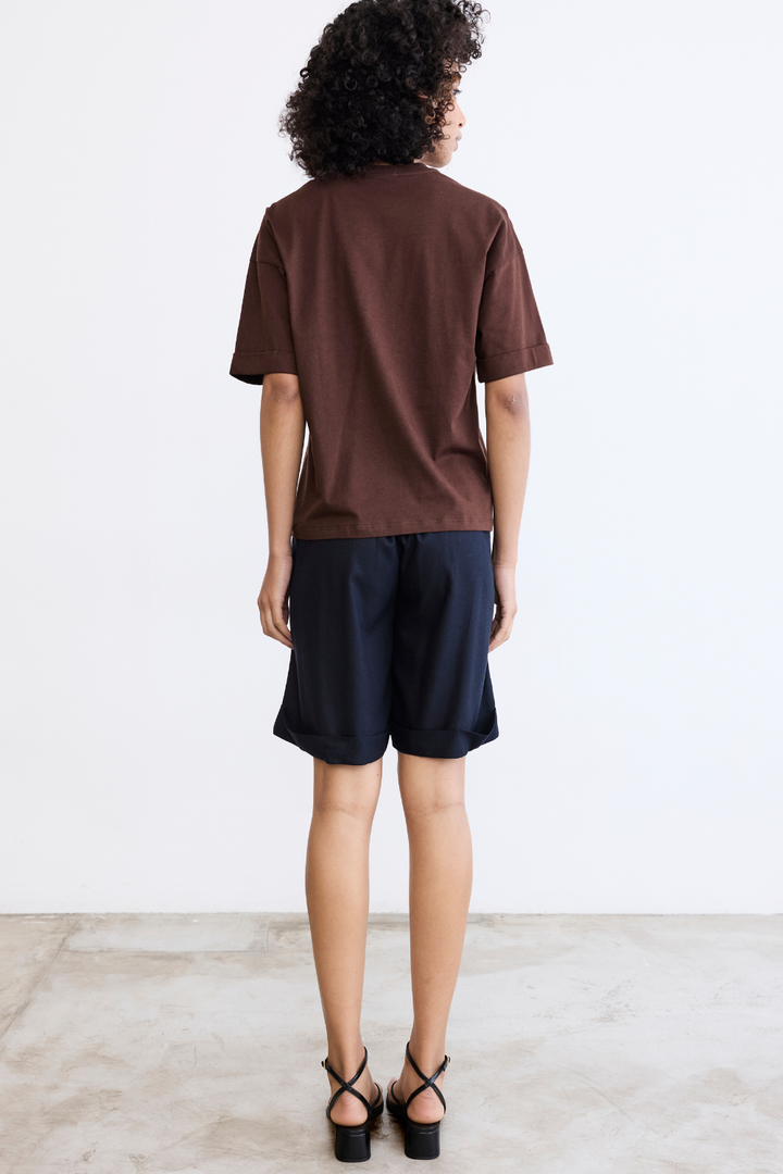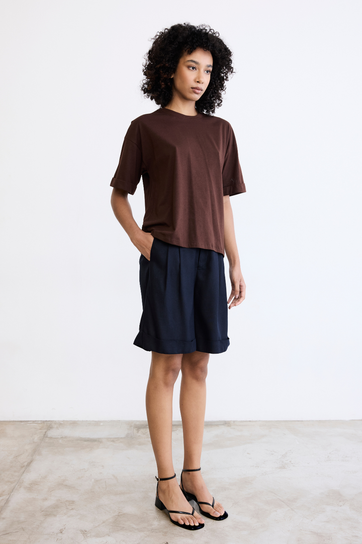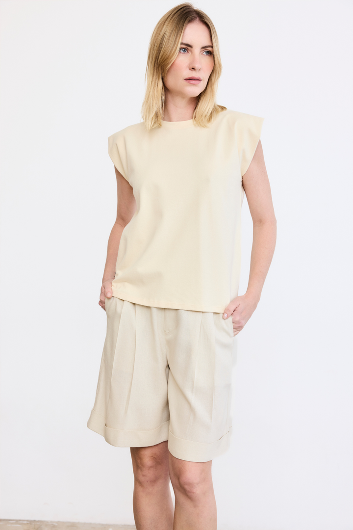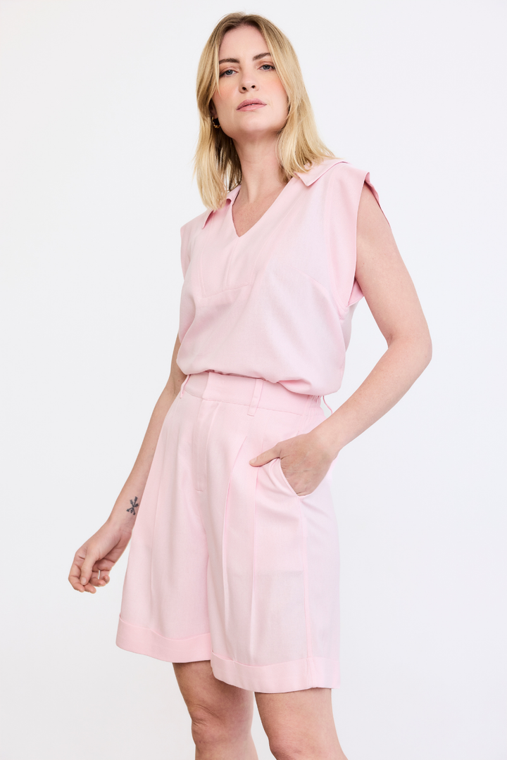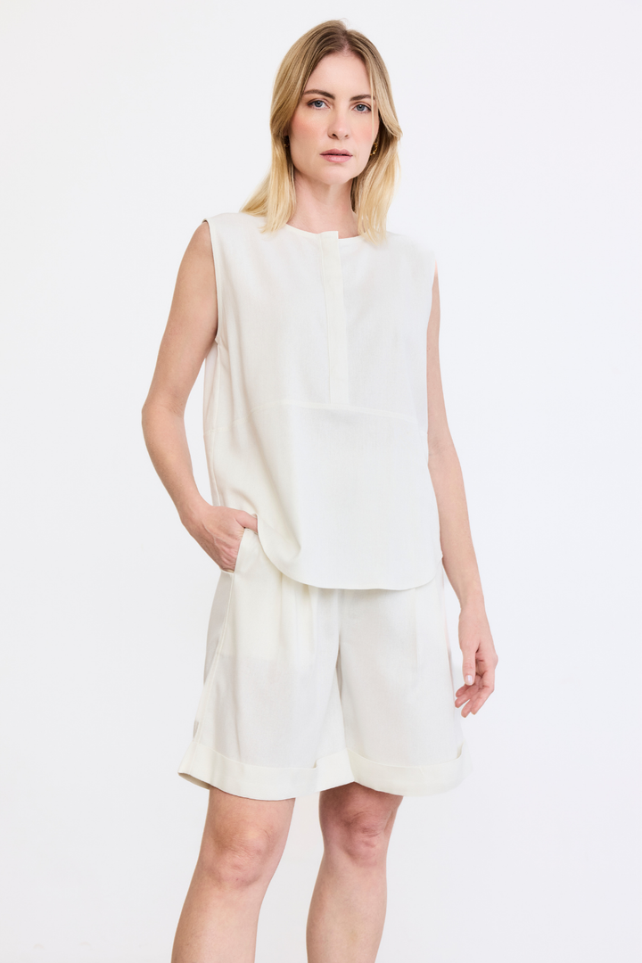 Nossa bermuda Ruth foi modelada em tecido de viscose com linho, amaciado , produzido no Brasil.