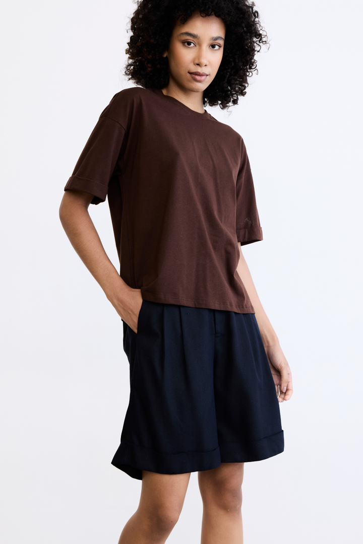 Fit confortável e solto com pregas frontais e bolsos, comprimento comportado, com barra italiana. Cós com passantes e elástico nas costas.