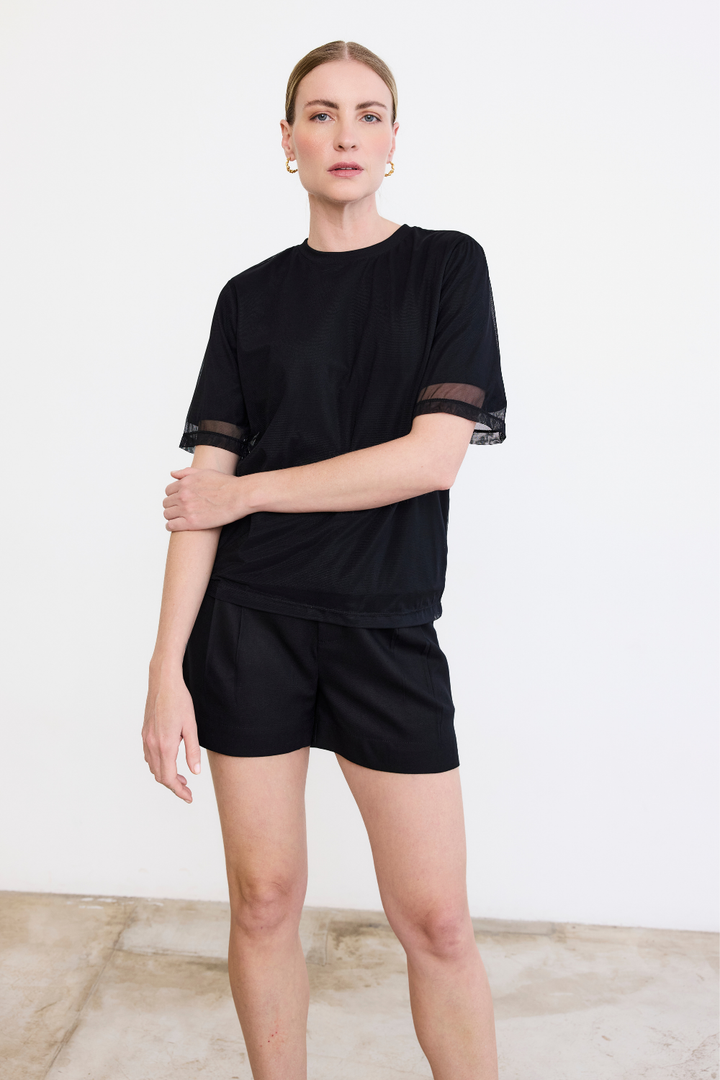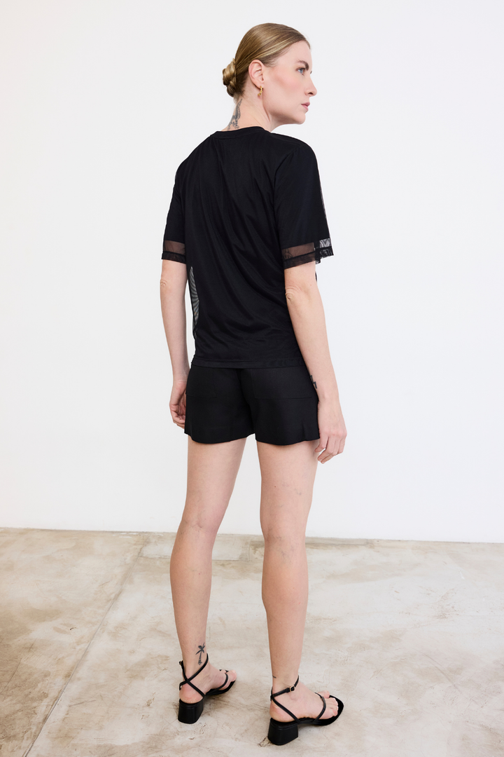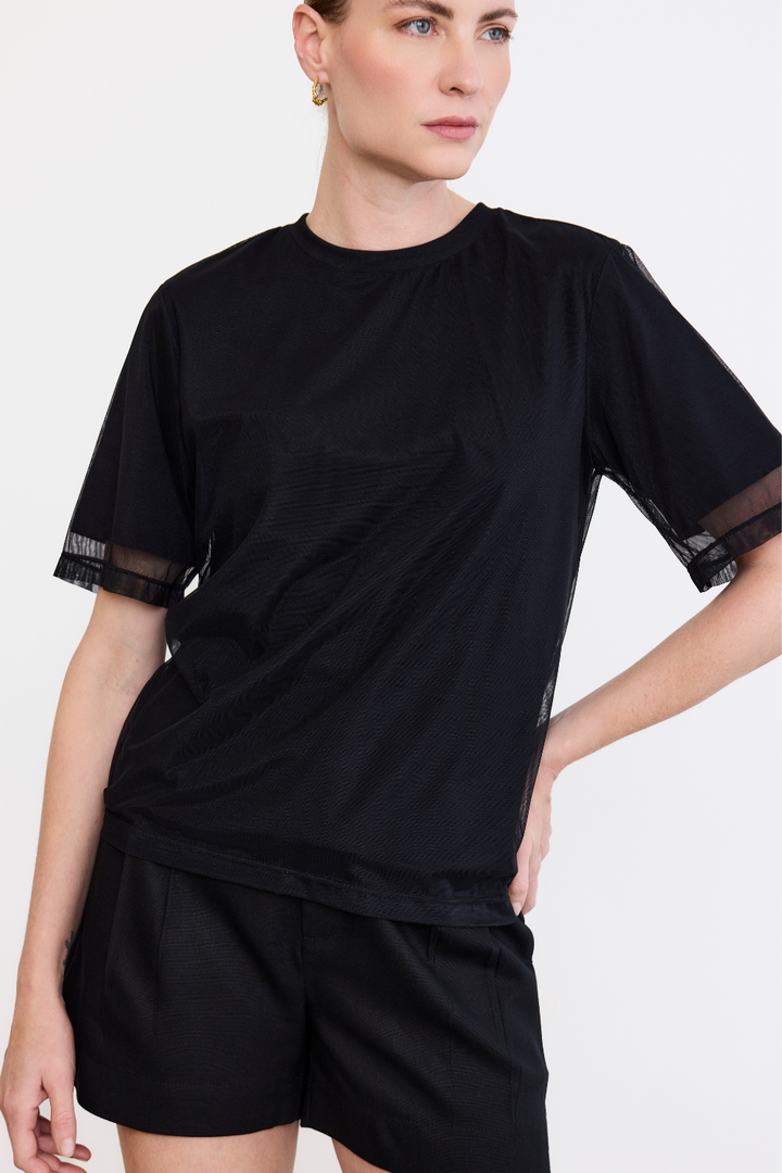 Uma peça com sobreposições de tecidos diferentes, na base de uma tule maravilhosa de poliamida fabricada no Brasil e interna, a nossa meia malha penteada muito confortável.