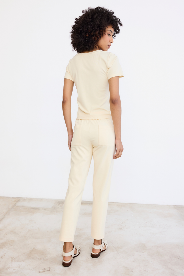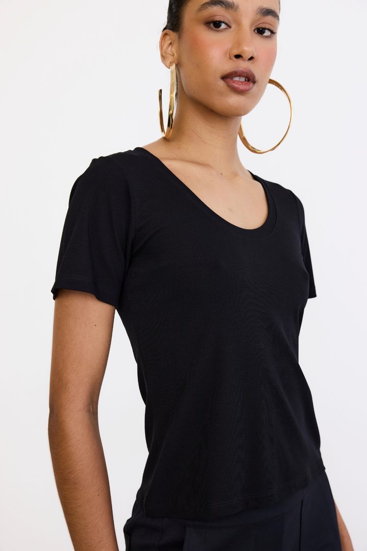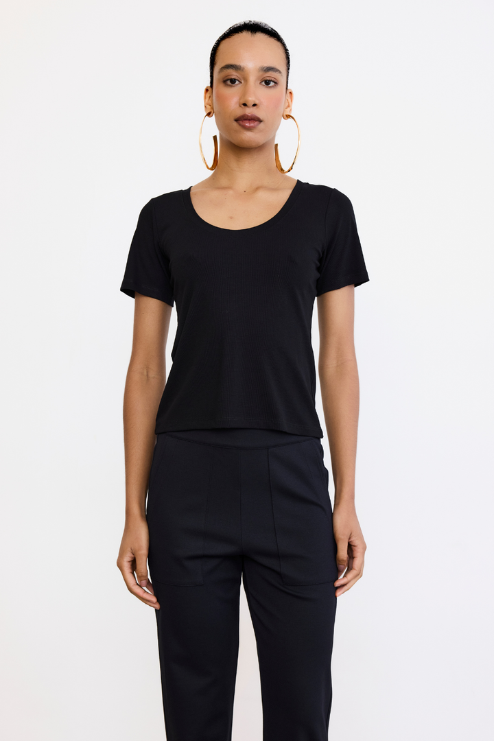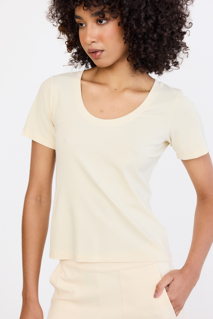 Tem um fit baby-look, mangas curtas em decote careca bem pronunciado.