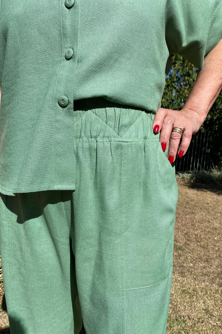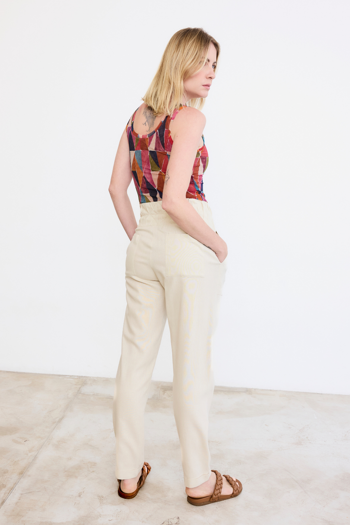 Nossa calça Malu foi desenhada com uma modelagem nova: mais sequinha e com um cós todo trabalhado com elástico, um cós mais largo adornado que valoriza a peça e o visual.