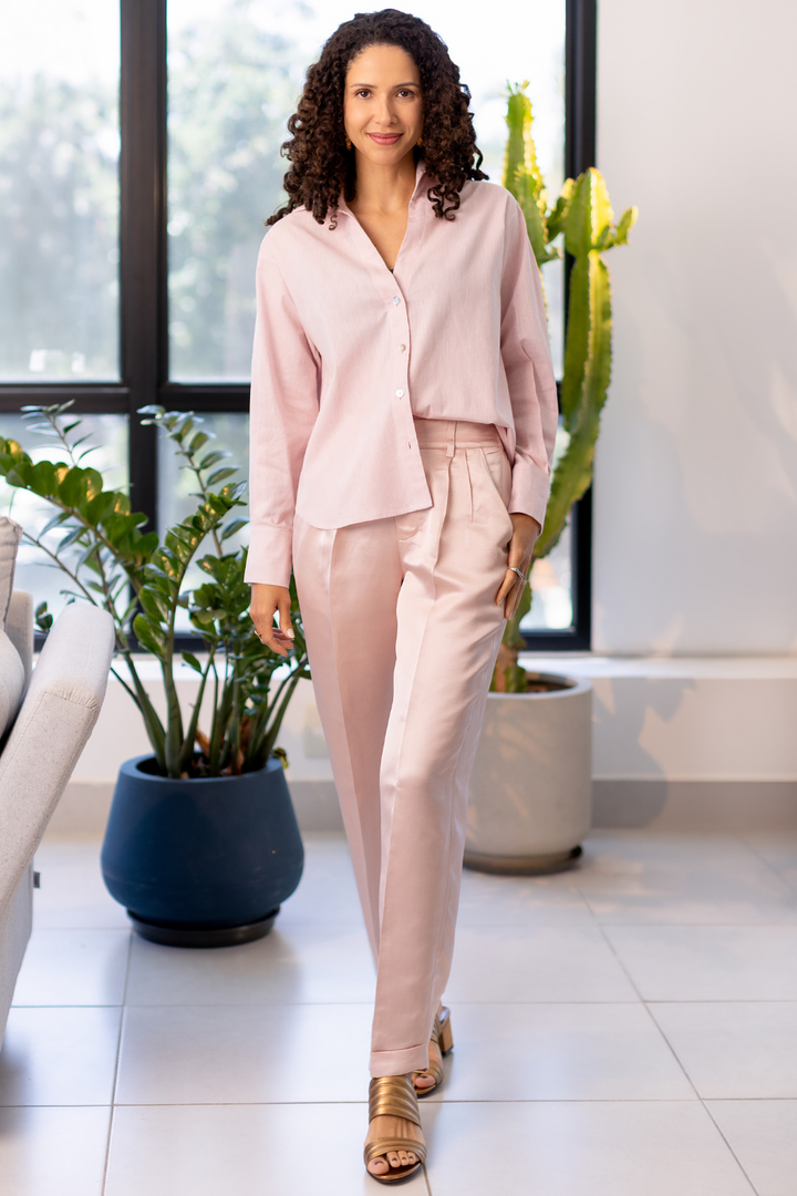 Nossa calça Paris foi feita em um cetim muito nobre de viscose com linho com um brilho muito atenuado.