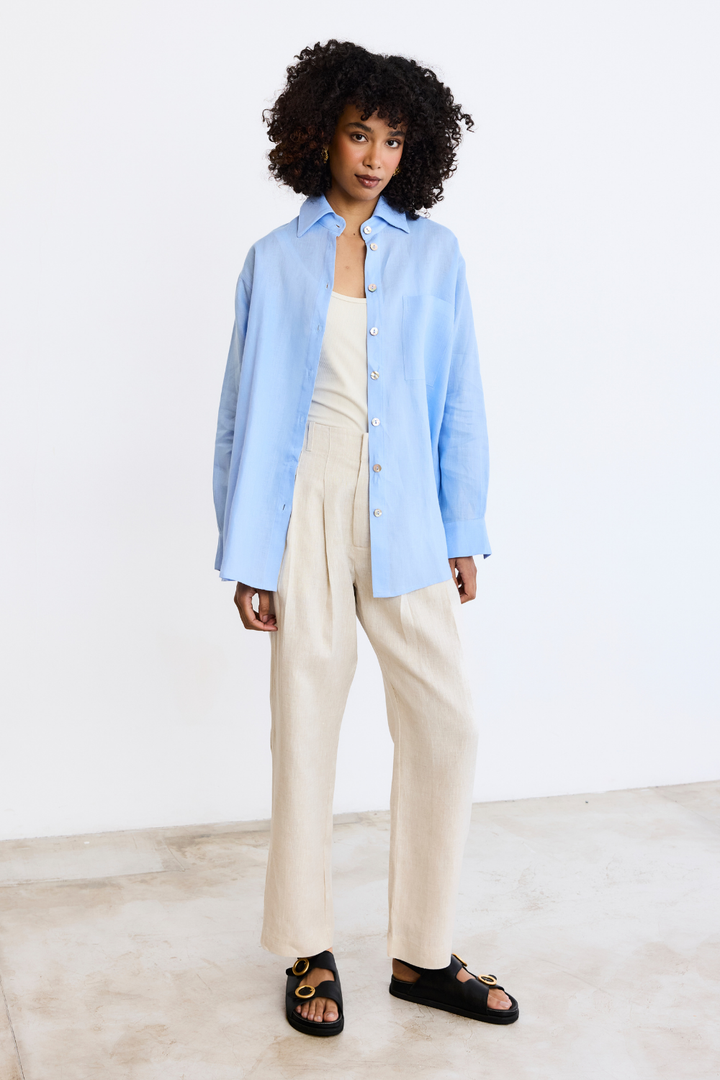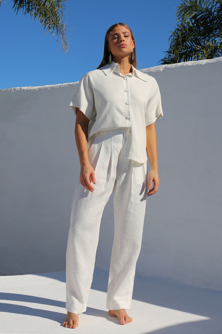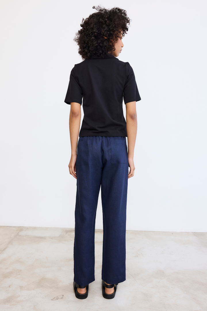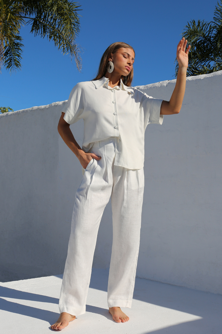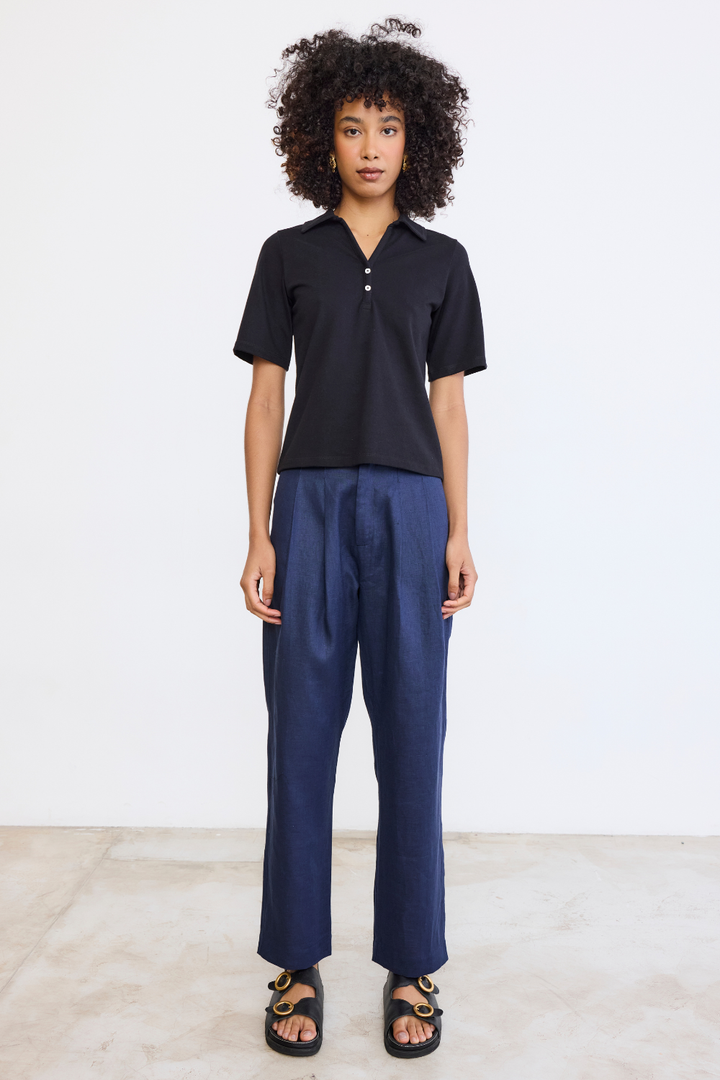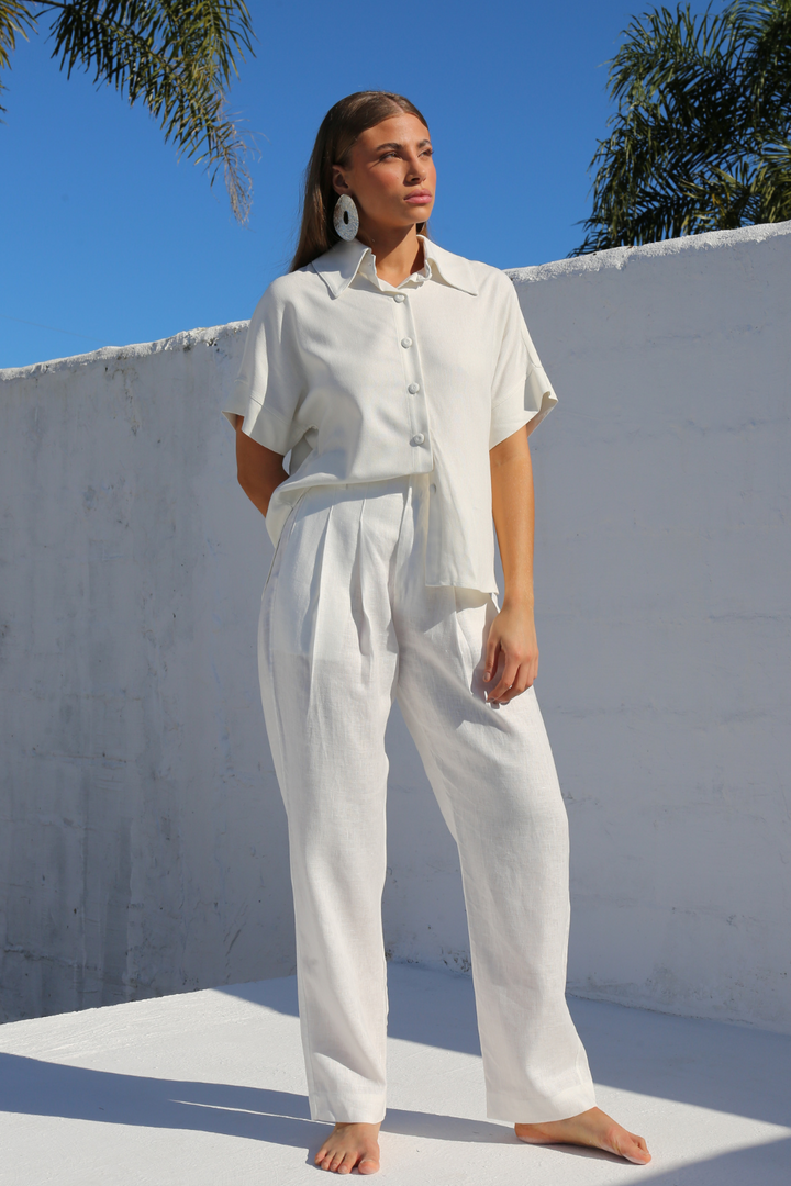A calça Pipa, foi desenhada com um corte muito clássico e feminino: pregas frontais, bolso faca e uma modelagem "cenoura", com as pernas mais afuniladas e curtas. Fechamento frontal com gancho embutido, costas elásticas entregando vestibilidade e conforto.