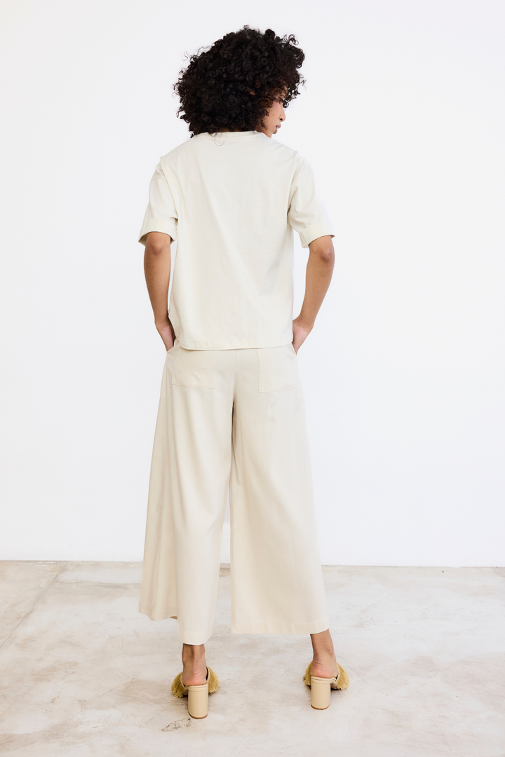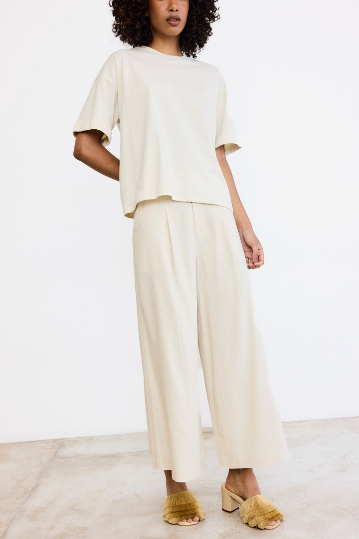 Com modelagem pantacourt, a peça tem cós anatômico que valoriza a silhueta, além de pregas frontais que trazem movimento e elegância. Os passantes no cós permitem o uso com cinto, e facilitando a composição de produções mais elaboradas.