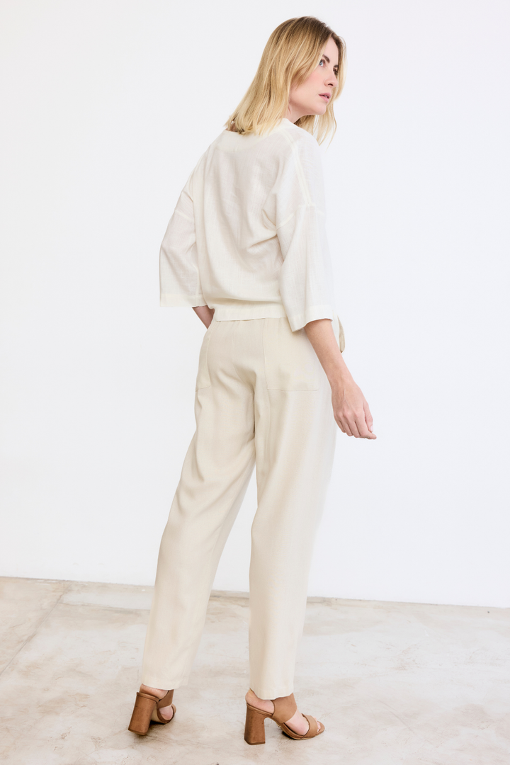 Nossa calça Ruth, feita com uma mistura nobre de linho e viscose de reflorestamento, produzido no Brasil, mistura estilo, conforto e consciência ambiental.