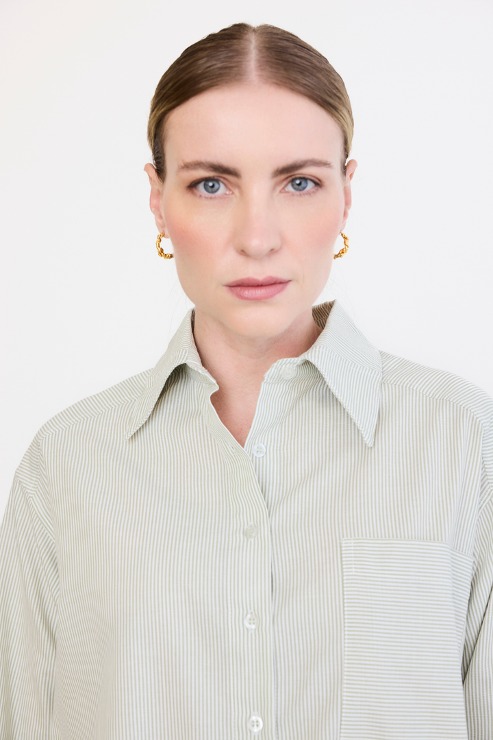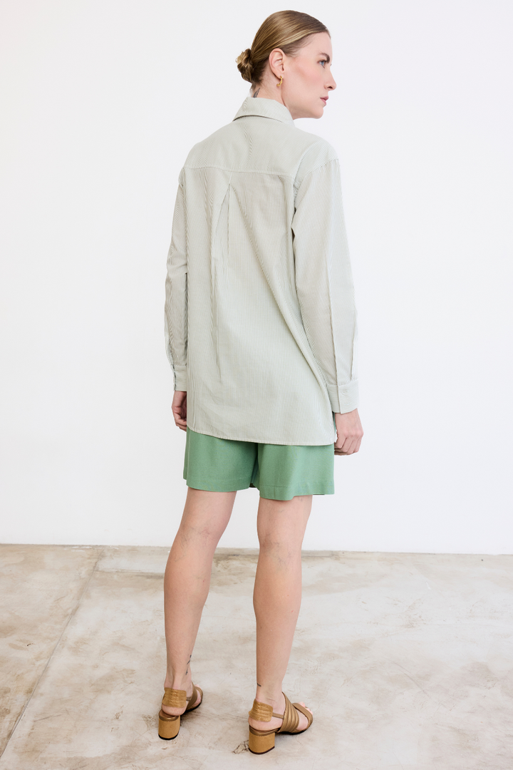 Nossa camisa Ieda, feita em fio tinto listrado produzida no Brasil 100% algodão com toque amaciado.