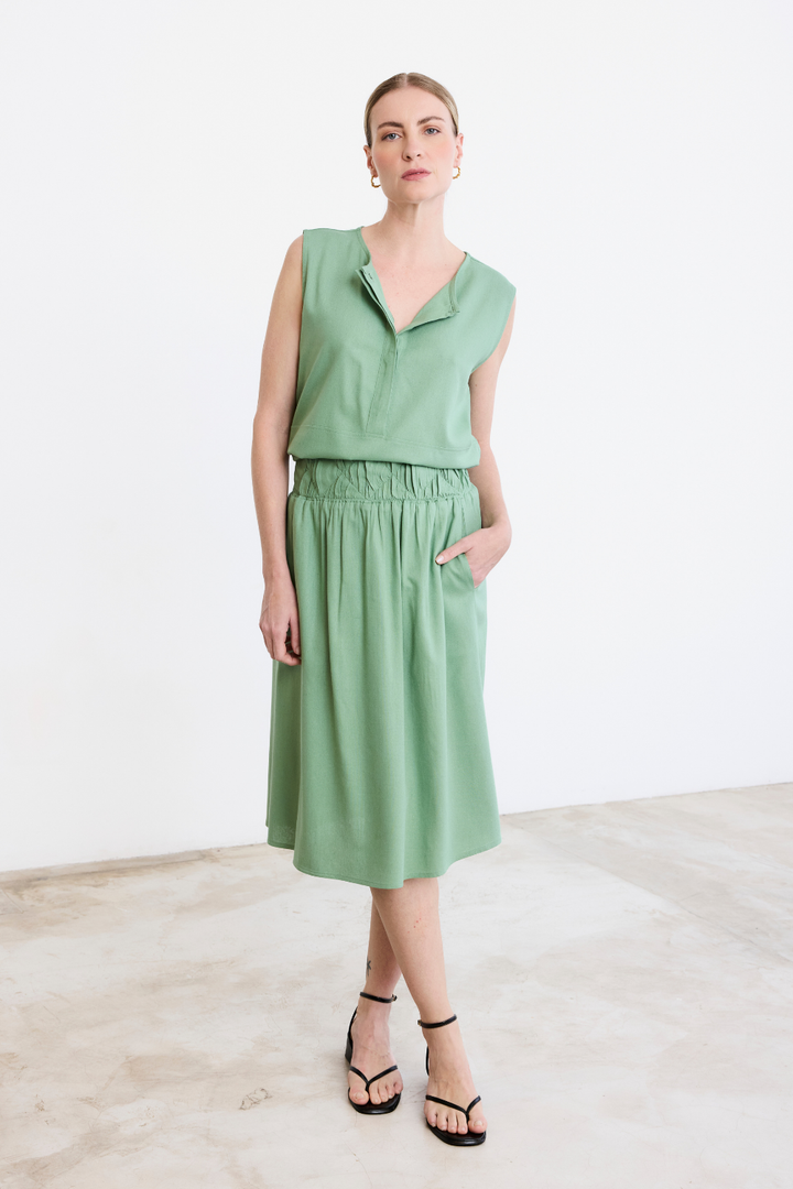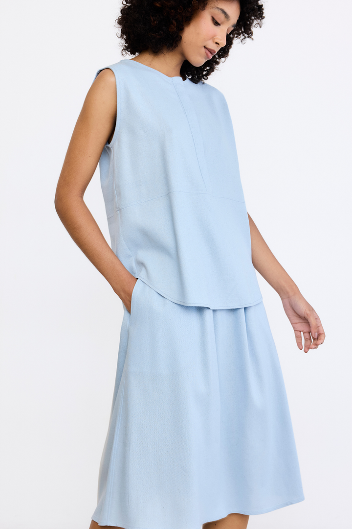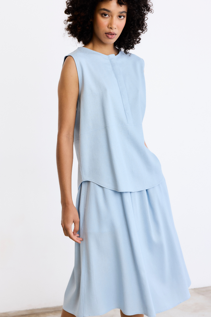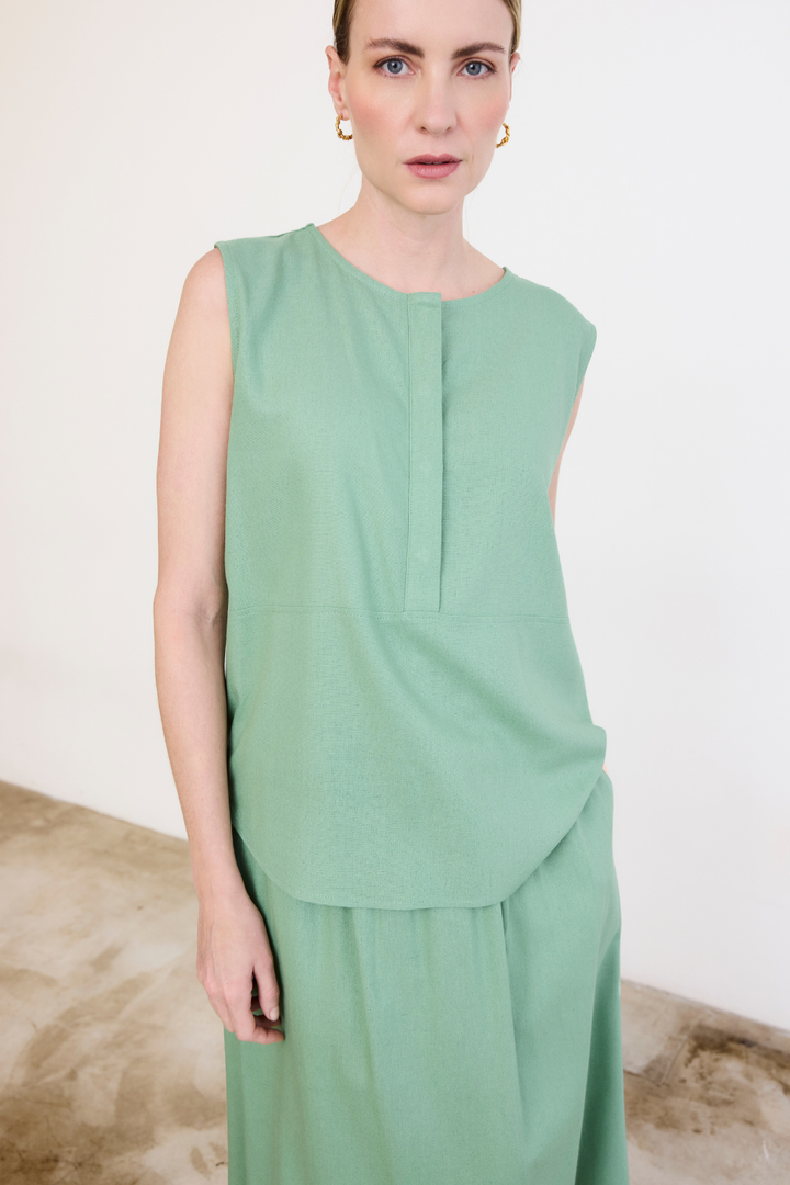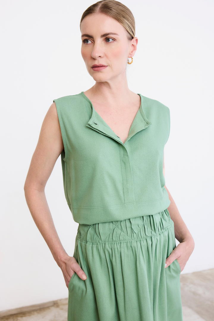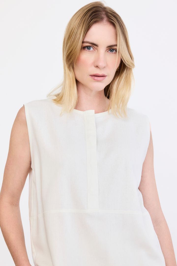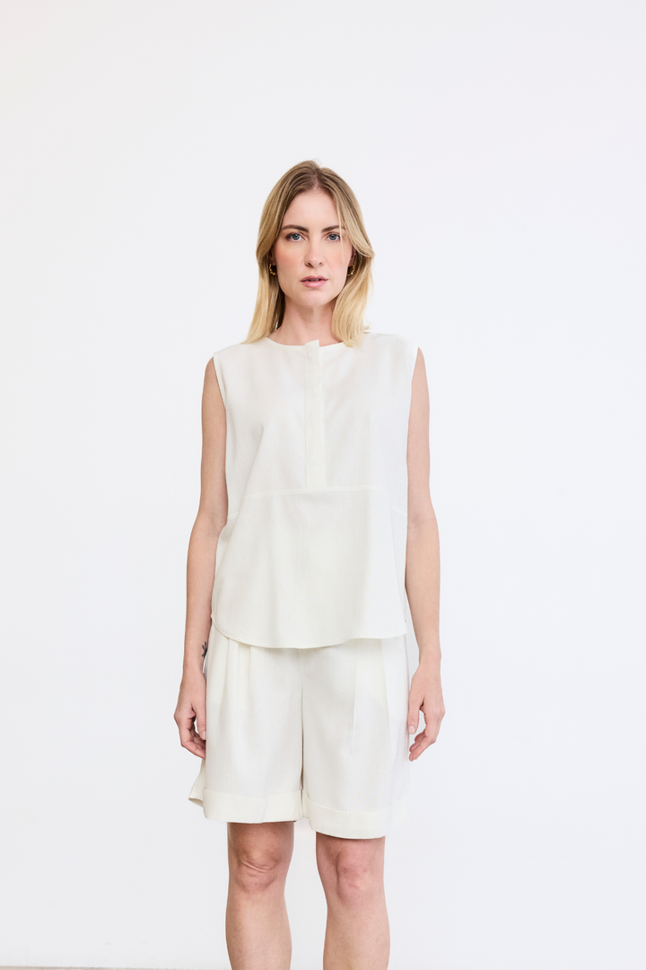 Fit confortável e solto com decote careca e botões com vista coberta. No comprimento do corpo um recorte que remete à uma bata, e barra levemente arredondada que arremata o acabamento com delicadeza