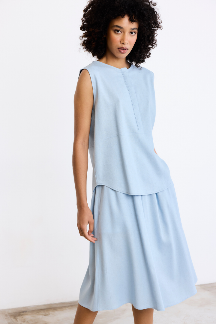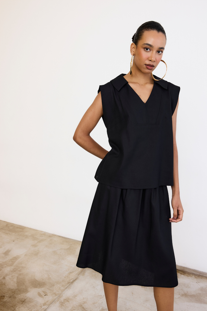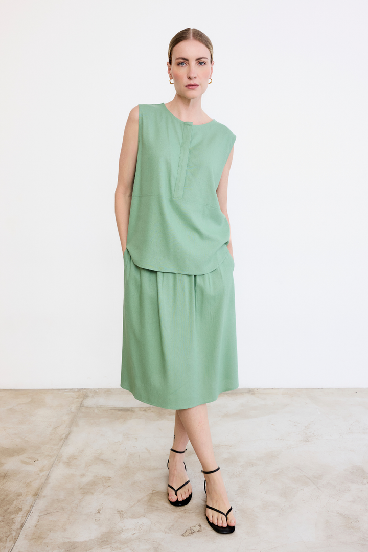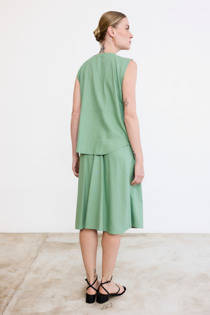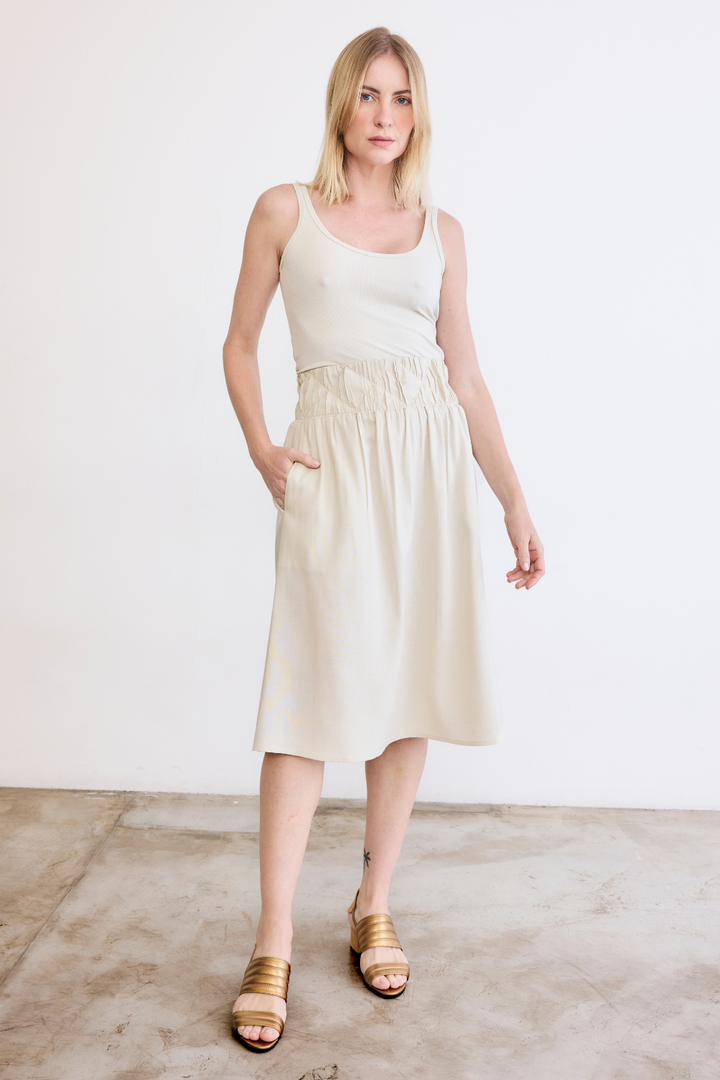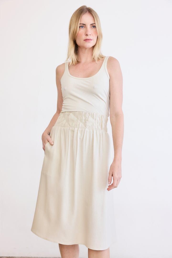 A nossa saia Malu foi modelada em tecido de viscose com linho, amaciado , produzido no Brasil.